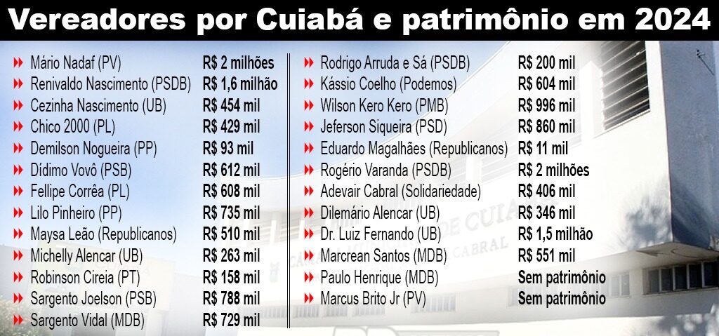 Dos 25 vereadores que a Câmara de Cuiabá possui e que vão à reeleição, 18 deles venceram mais ricos nos últimos 4 anos, se comparado ao patrimônio que foi declarado à Justiça Eleitoral em 2020 e 2024. Outros 5 candidatos acabaram vendo parte do patrimônio derreter e outros 2 declararam estar zerados, sem qualquer tipo de bem ou saldo em conta bancária. As informações disponíveis estão no DivulgaCandContas, do Tribunal Superior Eleitoral (TSE).
